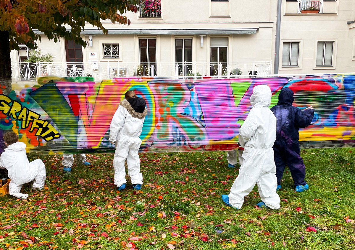 Einblick in die Arbeit von Graffiti-Künstler:innen und Ihrer Kunstform erhielten die Kinder und Jugendlichen im nächsten Workshop: Mit Farbdosen bewaffnet und in weiße Schutzkleidung gehüllt, konnten sie letztendlich selbst aktive werden und eigene Graffitis sprühen. Legal natürlich!